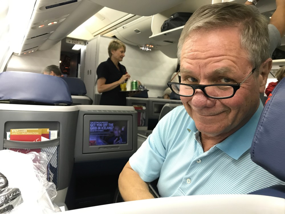 Jerry, looking at me in the Delta One seat behind him.Flat bed sleeping direct from JFK to Venice. Shocking waste of money, but I was cozily grateful as I snuggled under my Westin Heavenly Bed comforter. My restless legs meds knocked me out. I declined dinner and woke up to Alps and Lake Maggiore out my window.