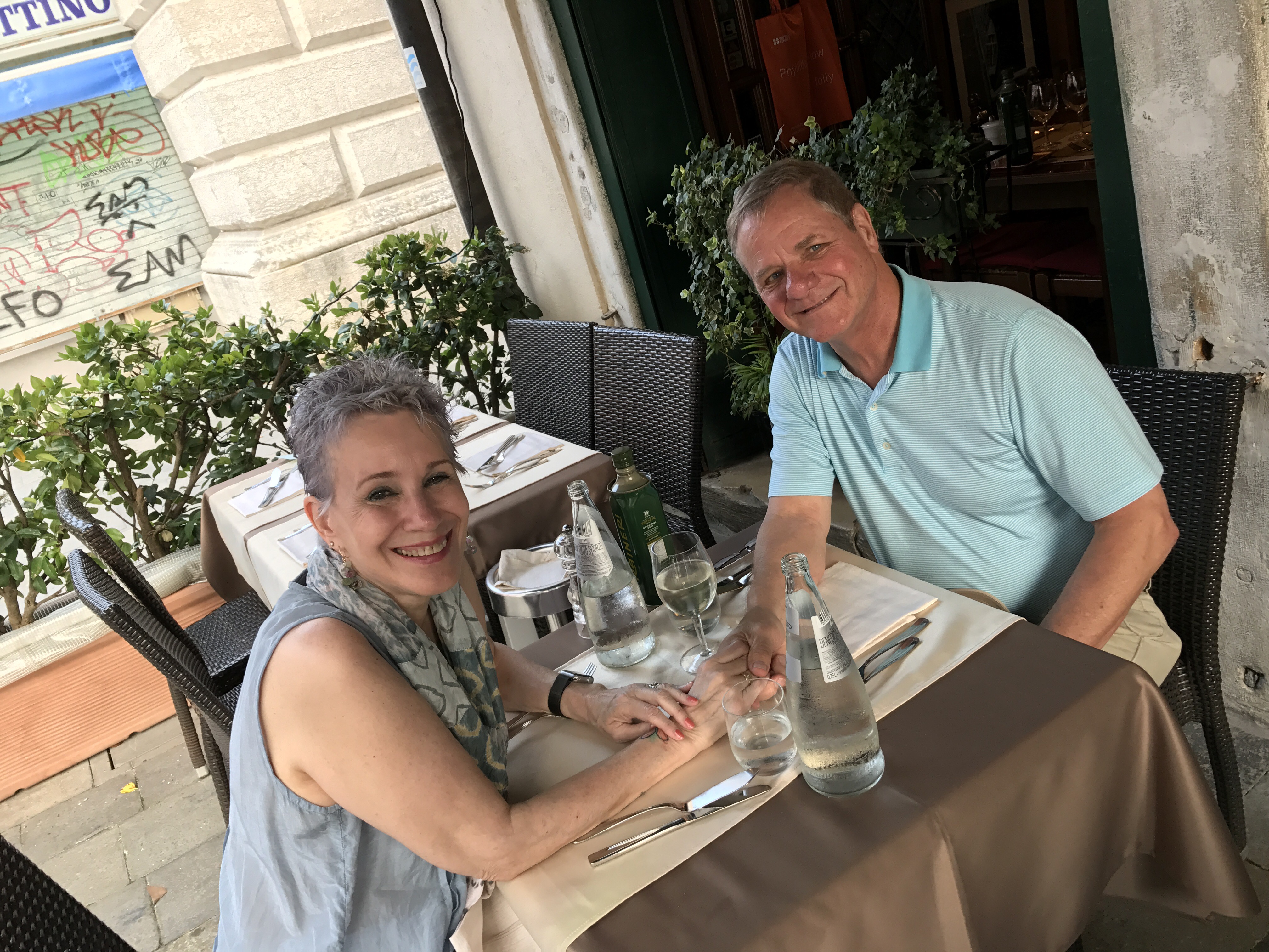 Roasted branzino and boiled potatoes in asparagus sauceTotally stuffed, we wandered back to the hotel. Up one side of a bridge, down another, along the canal. It wasn’t long, but I was dizzy with tiredness and humidity by the time we arrived. It’s probably the longest I’d walked since surgery and the end of a very long day.