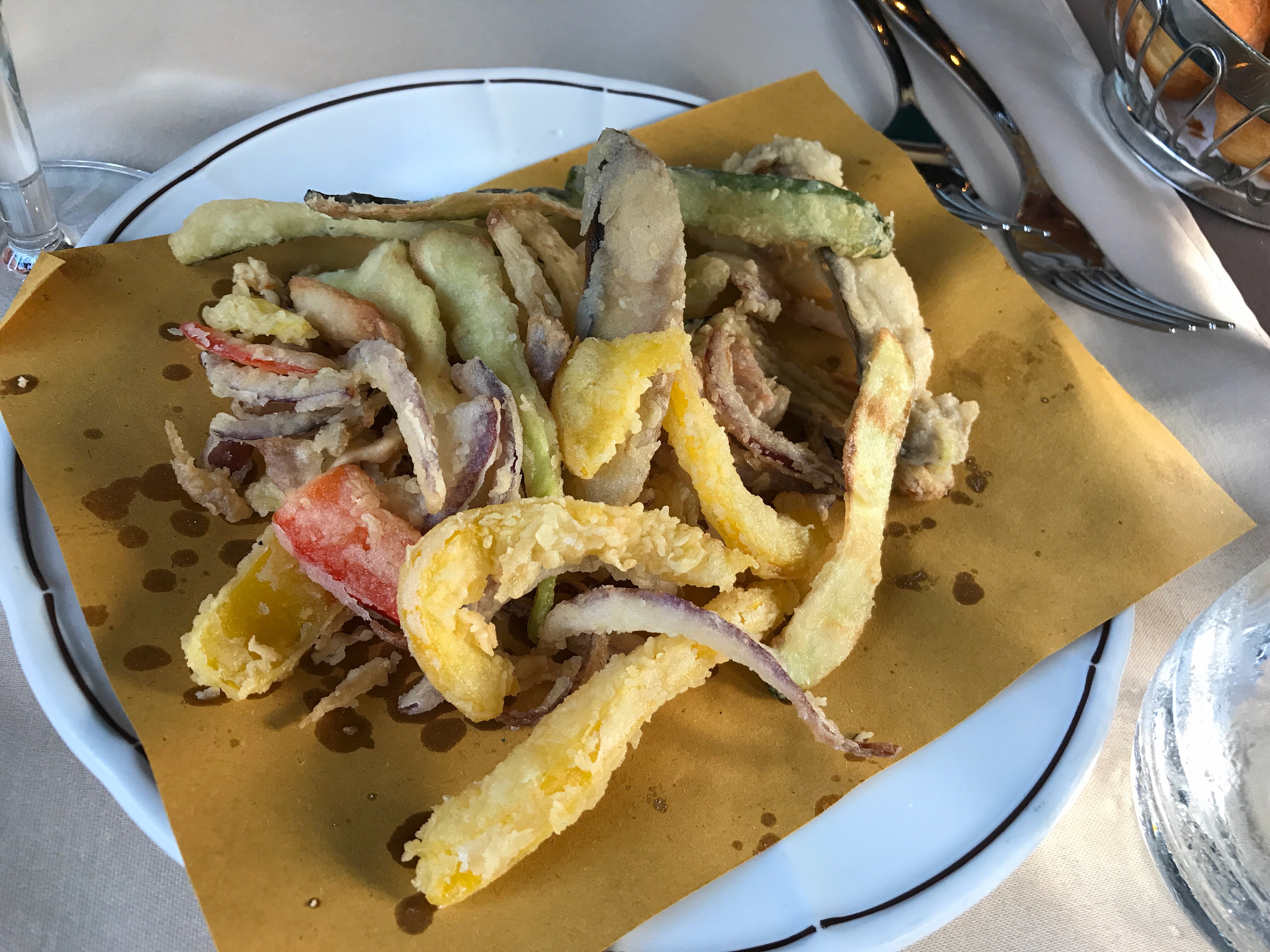 Tossed at Sea, Il Nuovo GaleonThe first thing that appeared on the table (after the rolls) was a “gift” of fritto misto of slivers of vegetables, served on brown paper to soak up the oil. Fried food are not on the pancreatic diet but I was well fortified by pig pills so I had a few. Ethereally crispy, intensely flavorful. A gift indeed.