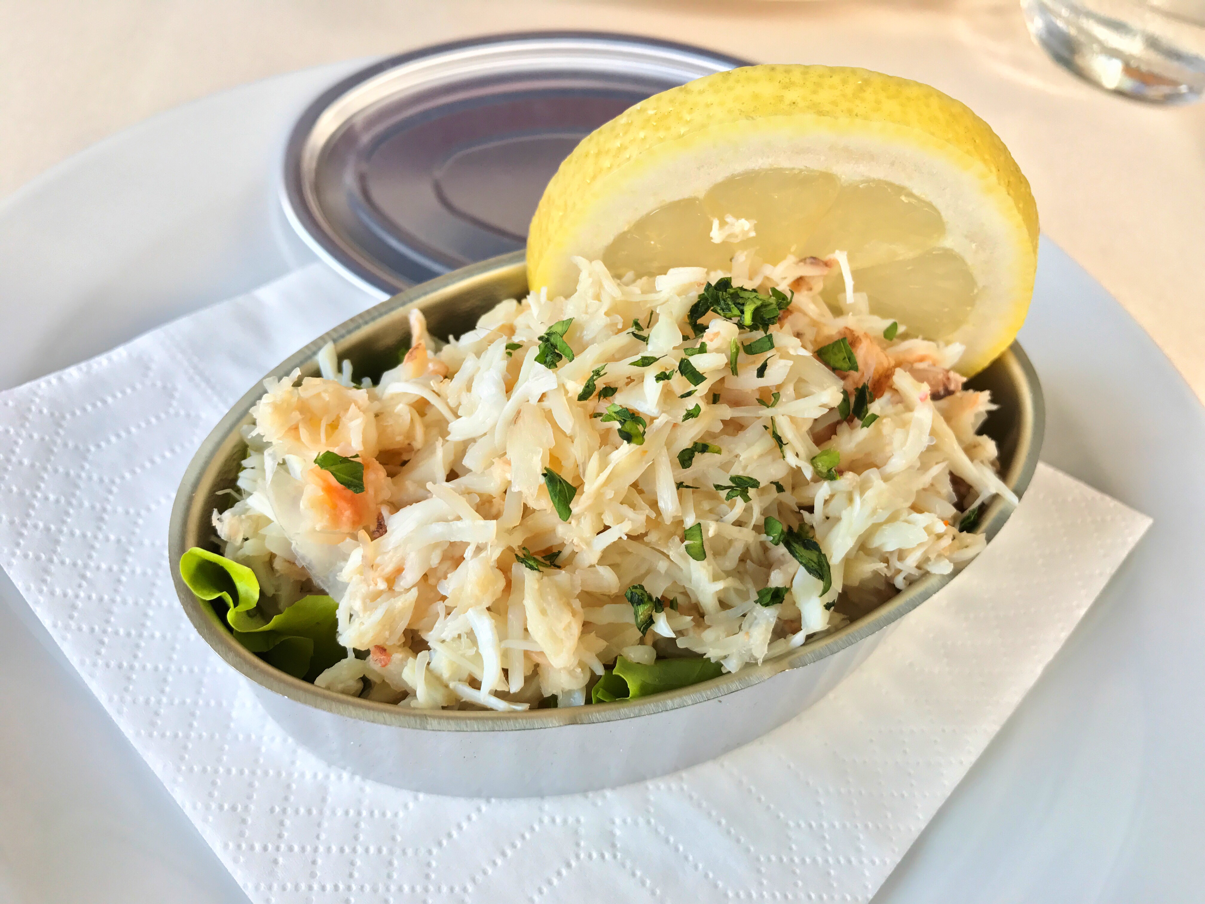 A “gift” of fried veg, Il Nuovo GaleonWhile we were nibbling, our first course showed up. Served in a can which only emphasized its freshness, it was the evening special of spider crab lightly mixed with olive oil, lemon, salt and pepper. I thought it was lovely, though it made Jerry remember that he is not all that fond of crustaceans.