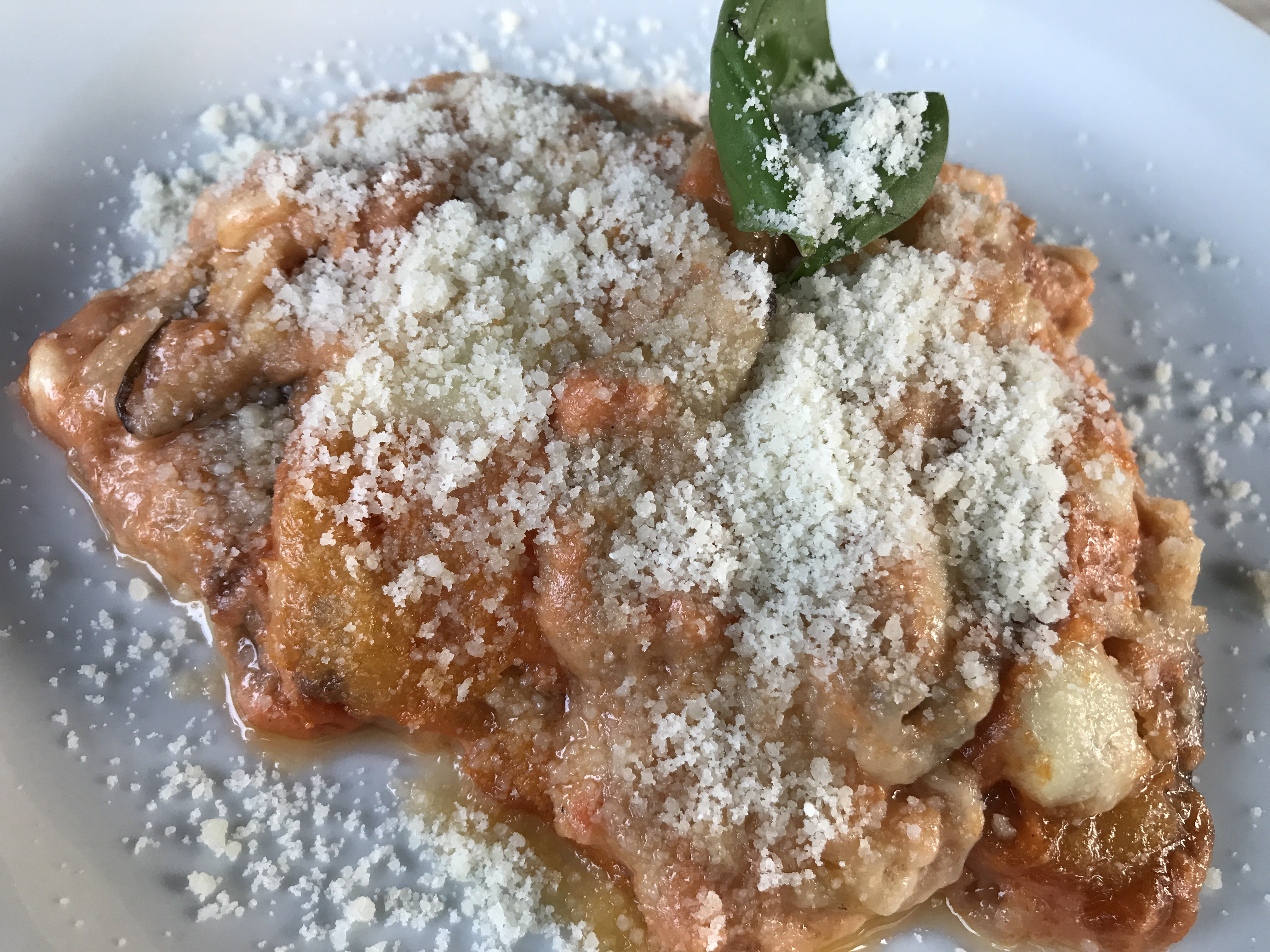 Fettuccini with prawns and zucchiniEggplant Parmigiana. Not much to look at, heaven to eatIt was incredible. I ate only half, determined not to have an attack of pancreatitis our first night out. Paper thin eggplant slices with chewy melted parmigiana in savory tomato sauce, it was not your Italian grandma’s eggplant parm. Why it was so good I couldn’t tell you. It was a mess to look at, a clumpish mix of cheese and tomato, covered with still more cheese and a single basil leaf, simple as could be, and exquisite. I had to force my hand away from the fork at the halfway mark.