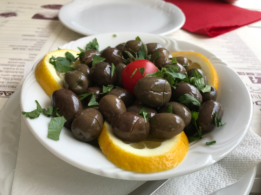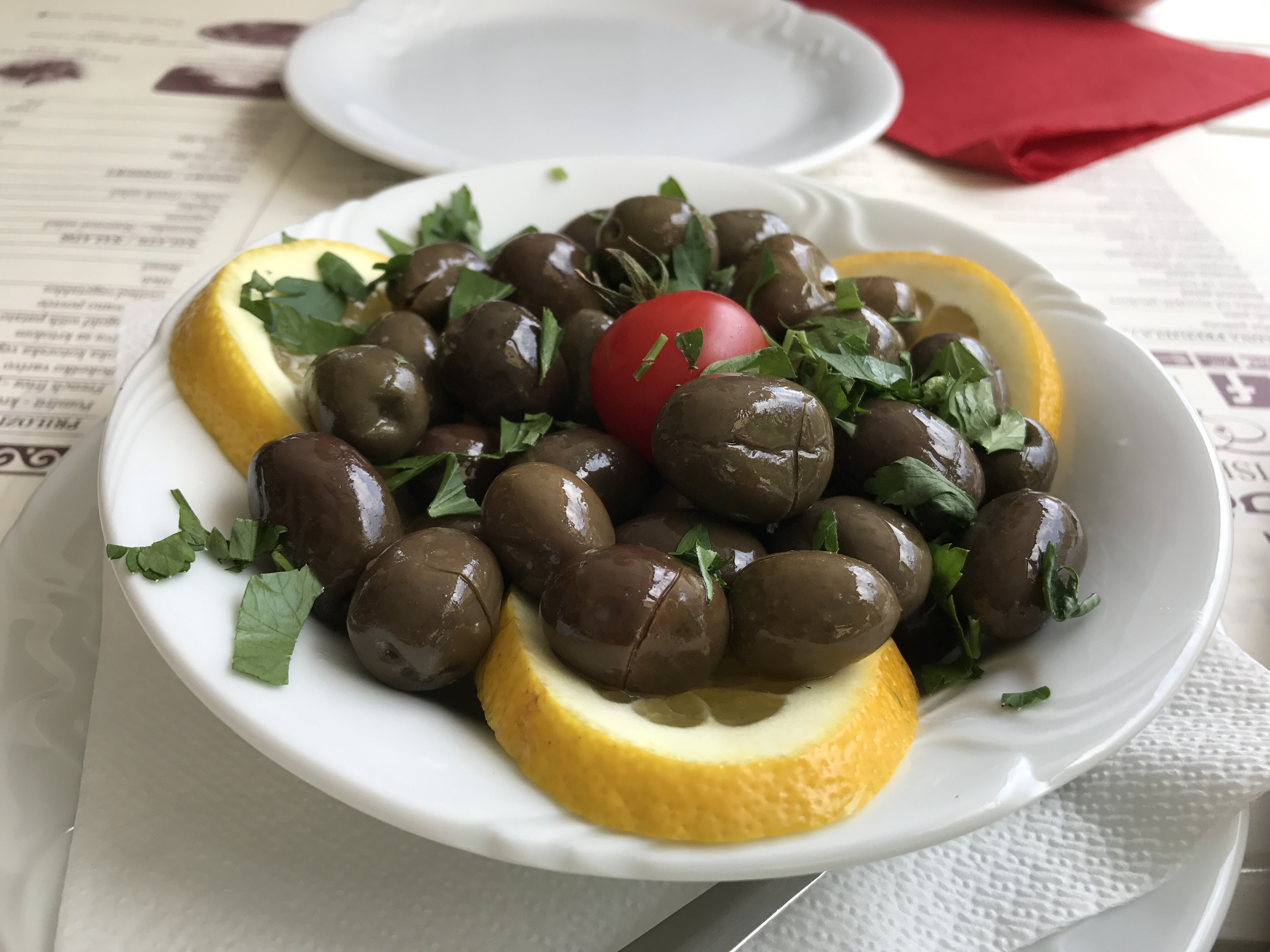We ordered domestic olives and cheese and salad to start. The olives were good — astringent and meaty. I asked about the types of cheese and pretty much they amounted to cheese cured in olive oil and cheese smoked. Since he pronounced it smoke-ed it sounded much more exotic than it tasted. Both were bland white cheeses.