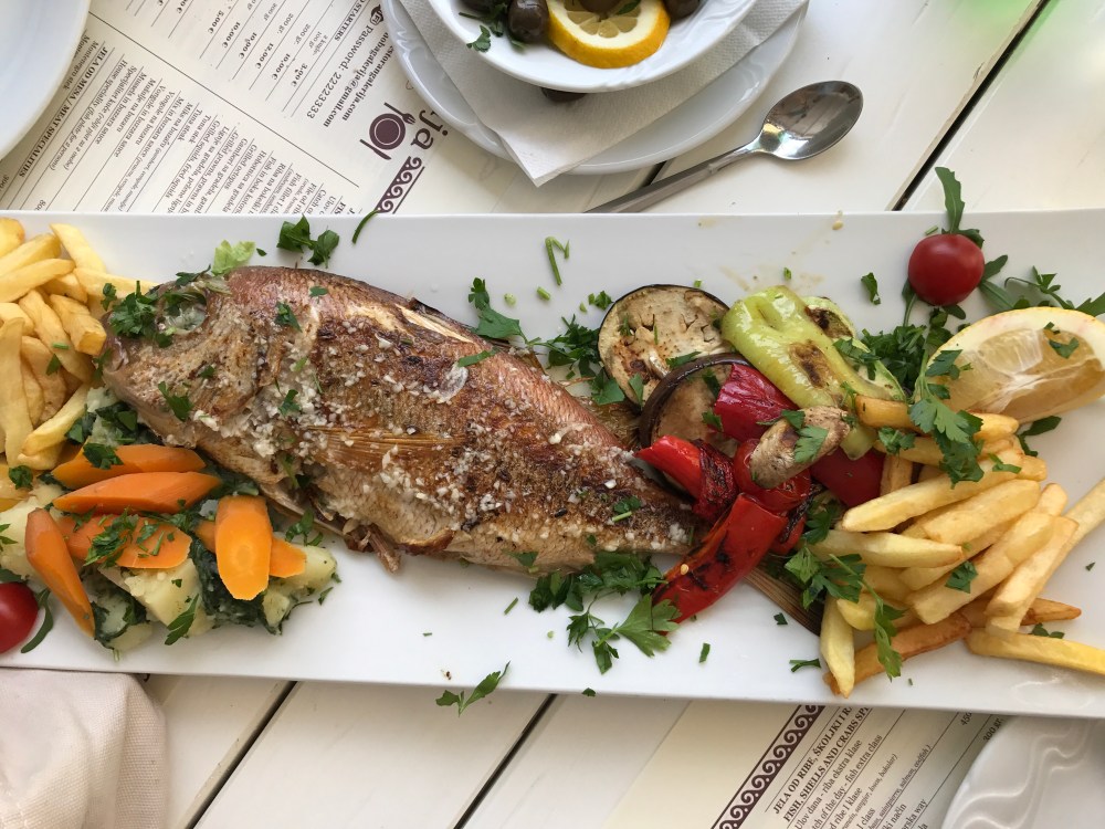 The fish (we chose snapper) was absolutely fantastic, grilled simply and lavished with garlic oil, a small bowl of which was served alongside, in case we thought we might be meeting vampires later in the day. The fish, expertly filleted tableside was surrounded with grilled vegetables, potato salad, spinach, carrots and French fries. I ignored the fries as by this time my stomach was in active revolt, despite a dose of pig pills. But god that food was good.