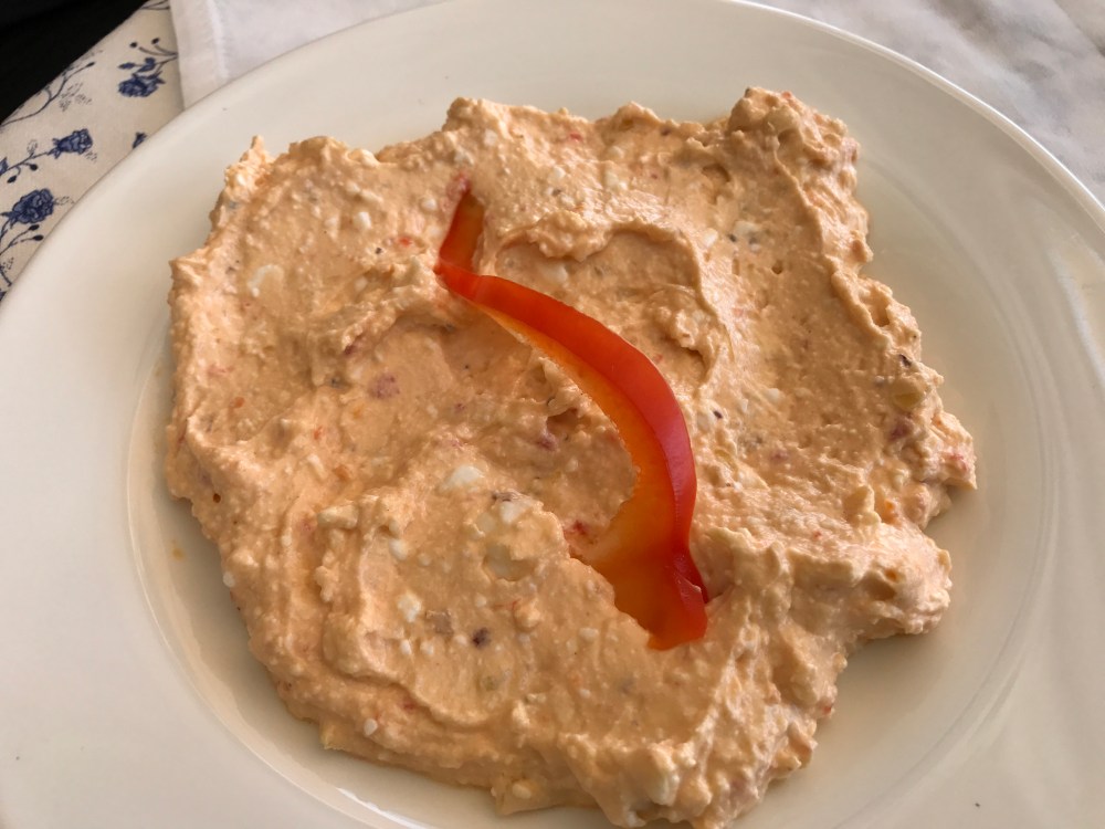 So I had something called spicy cheese dip because it was a mystery, which turned out to be feta mixed up with a bunch of chilies and something that made it pink, probably red bell pepper. Too spicy for this tummy.
