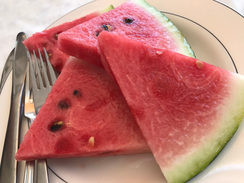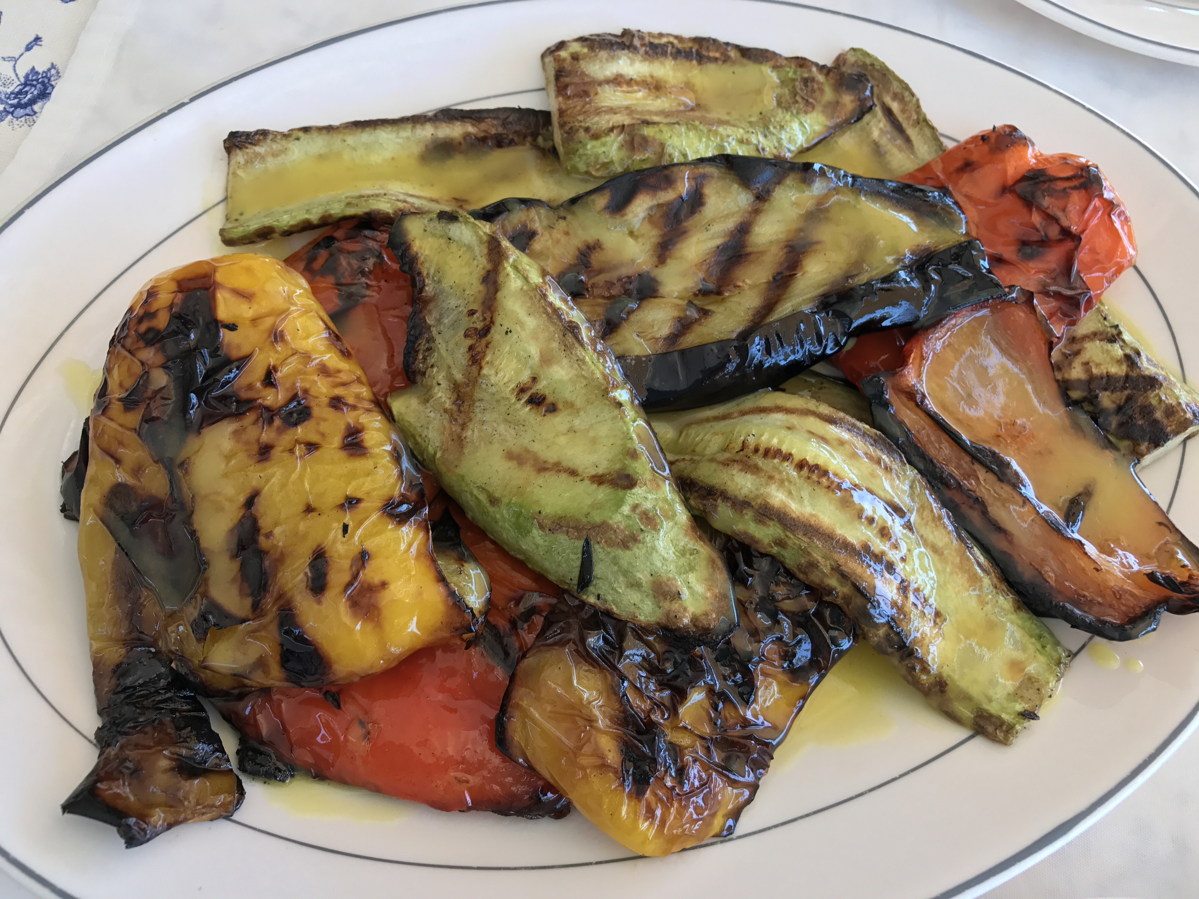 I also ordered grilled vegetables and they were just fabulous. Eggplant, zucchini and peppers, grilled til caramelized and drizzled with olive oil that had a nice grassy bite. She brought us ripe red watermelon to finish. It was a good lunch.