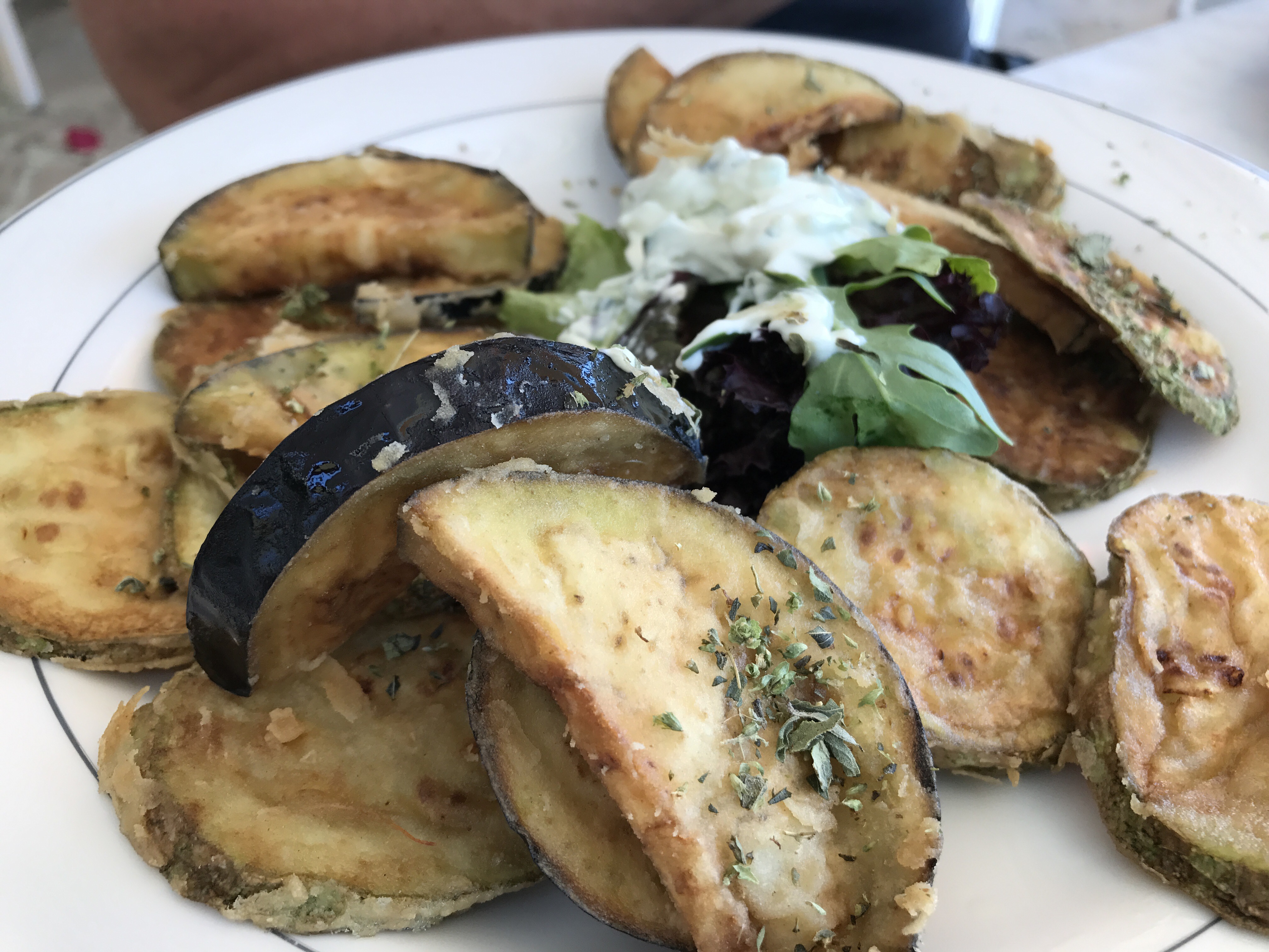 I also had an order of fried eggplant and zucchini because it reminded me of a favorite dish we used to order at Kalamares, a London restaurant, where they served it with an uber garlicky dip called skordalia. I asked the woman at today’s restaurant if they had skordalia and she asked me what it was. Hmmmm.