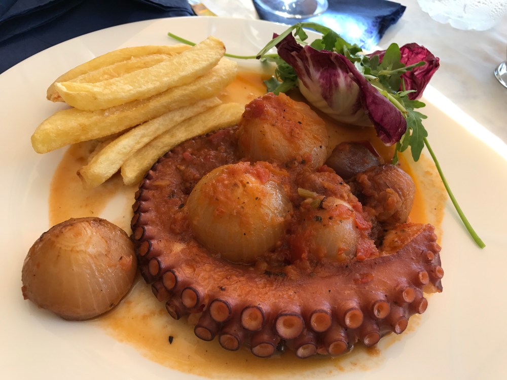Jerry ordered octopus cooked with onions and tomatoes. Must have been a huge guy. Just one tentacle pretty much filled the plate, curled around a nest of whole braised onions. Jerry said it was great.