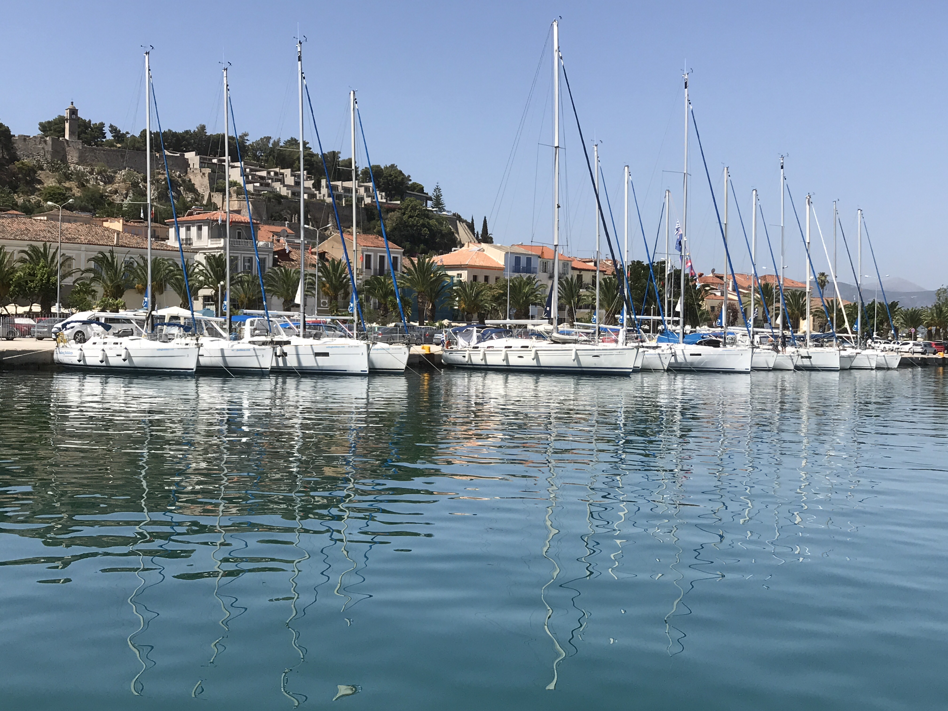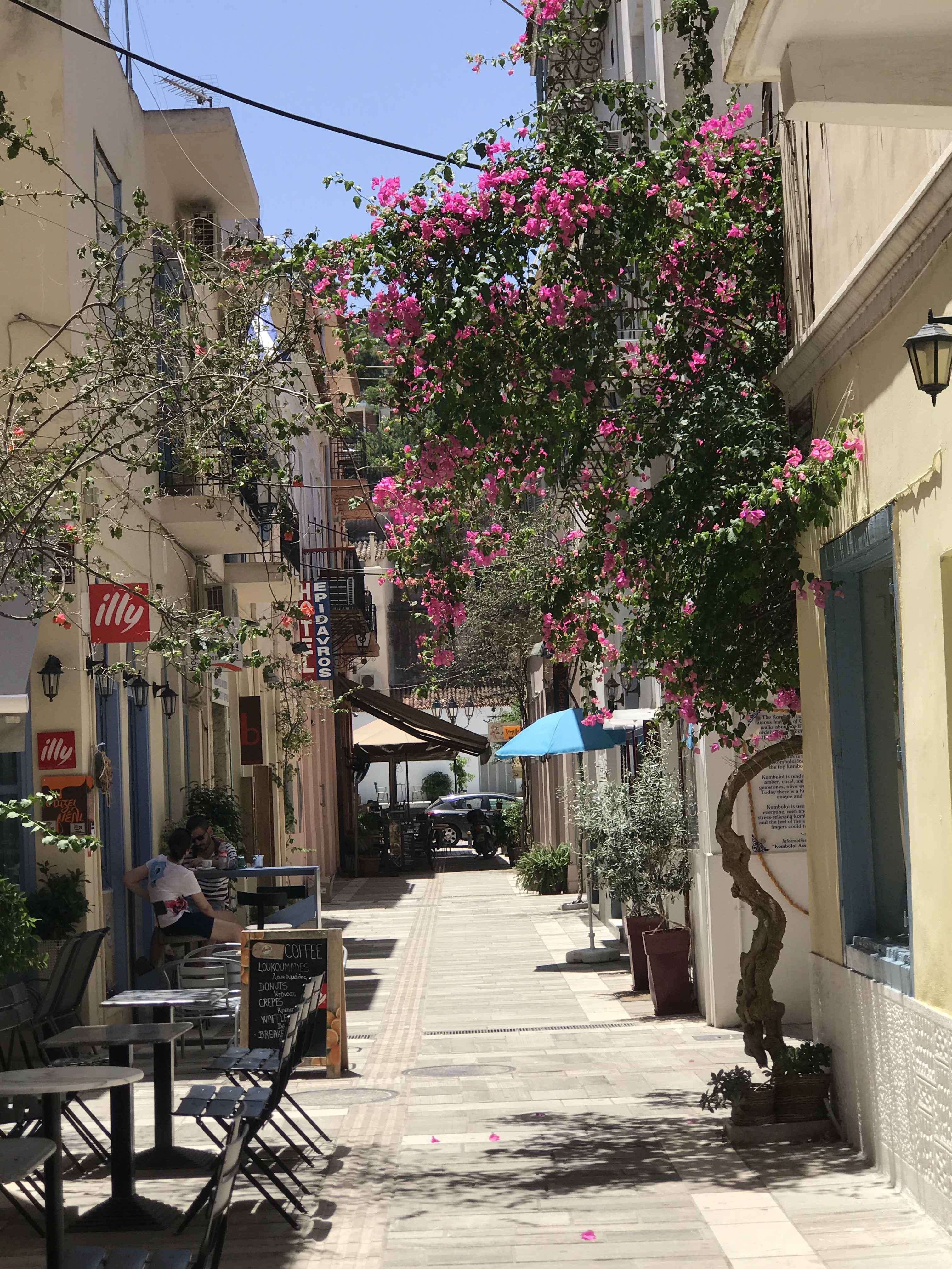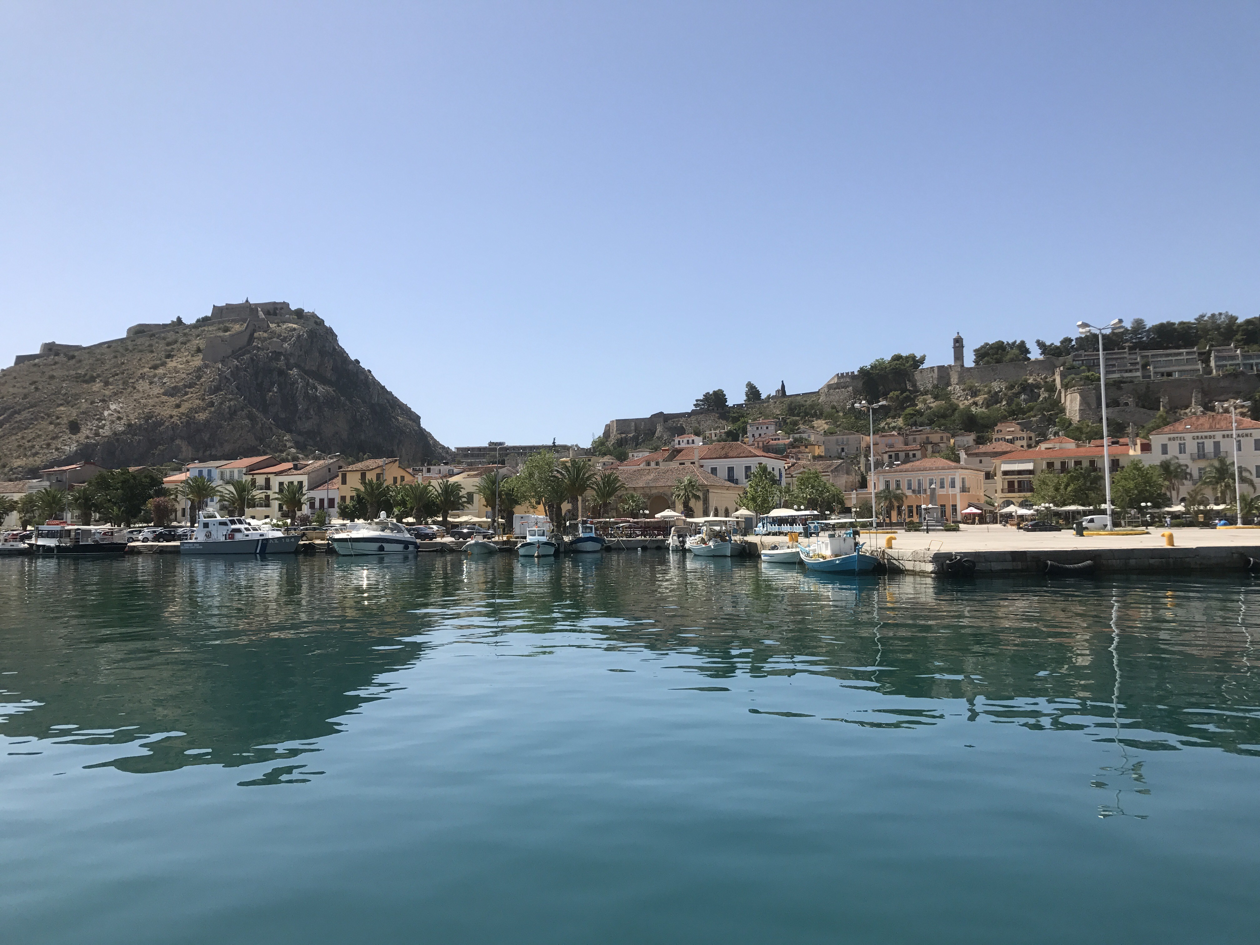 Nafplion is one of the most gorgeous towns I have seen. The bougainville are in bloom all over and the buildings are lovely, there are castles up in the hills, and the water around it is blue, blue, blue.