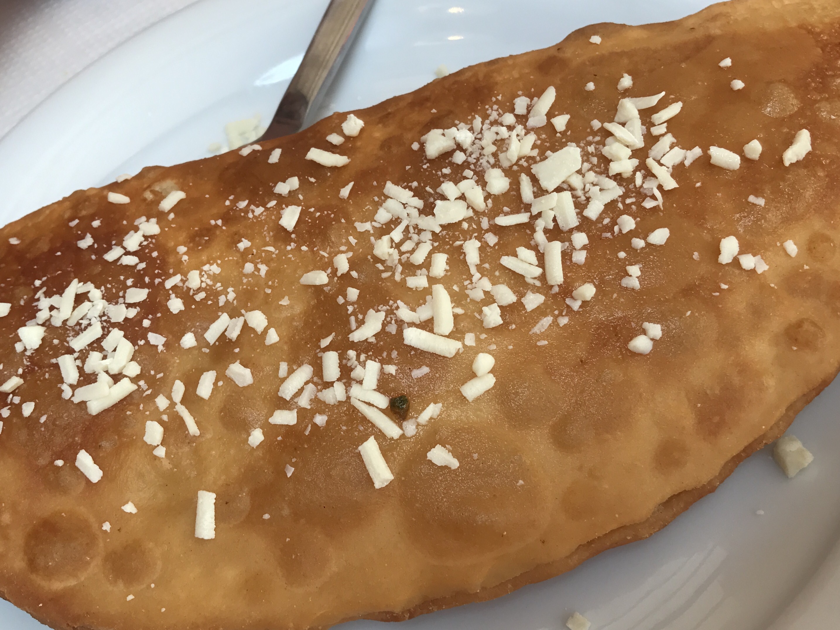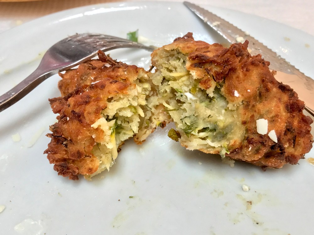 But the food was fantastic. Huge rolls, almost brioche-like with their eggy sweetness, split and drizzled with herby olive oil. A trio of spreads — tzatziki, eggplant, and spicy cheese. Fabulous saganaki. A giant cheese pie made with homemade filo, feta and myzithra cheese. Meatballs for Jerry. And zucchini fritters with mint.
