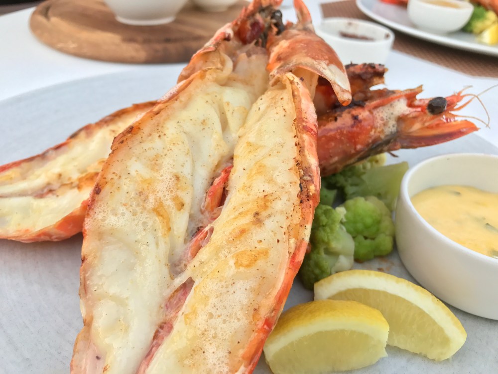 The night’s theme on the Patio was Surf and Turf — a big filet mignon and a colossal Nigerian shrimp. Jerry had that; I had the surf and surf. The giant crustaceans were amazingly good — sweet and meaty. You had to wrestle them out of the shell. More lobster-like than shrimp-like but wonderful.