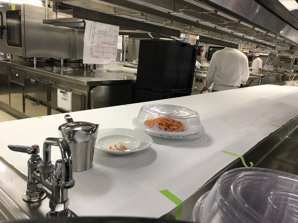 We pass the hot and cold appetizer stations, all wrapped in white paper, taped down. In fact, the white paper is lining all the counters where food is plated. This, he says, has been borrowed from Keller (who in addition to the Grill has a menu served every few days from the Restaurant and the Colonnade. There are separate stations where this food is prepared, again because Keller wants specific ingredients and techniques used in anything that comes out under his name.)