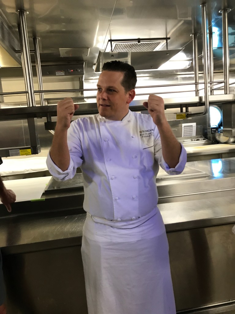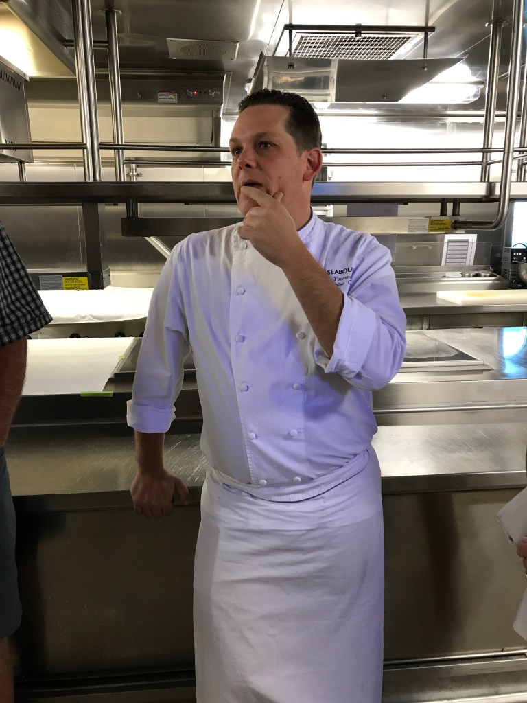 He’s been with Seabourn for ten years (plus one week, he says) and clearly knows the company well. Although he was discrete about corporate issues, he was heavily involved in the galley design of the new ships, opened the Encore and may take a similar role with the Ovation. All of which is to say, he knows his stuff.