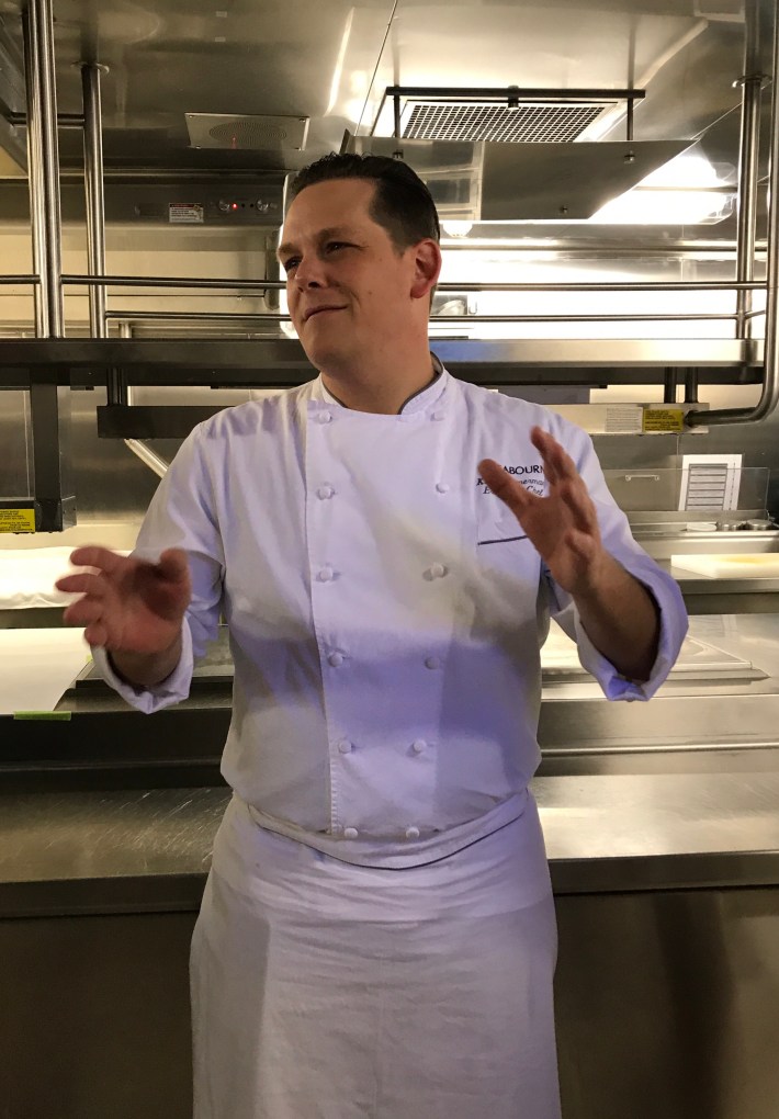 As executive chef, he oversees all the food production on the Encore — from the fanciest (the Restaurant, where night after night he expedites the entrees), to the Colonnade (buffets at breakfast and lunch, fixed menus at dinner) to the sushi restaurant, to the Keller Grill (although all the recipes, equipment and processes there are ultimately Keller’s and frequently differ from what goes on in the other venues), to the much more informal outdoor Patio (where we like to eat.)
