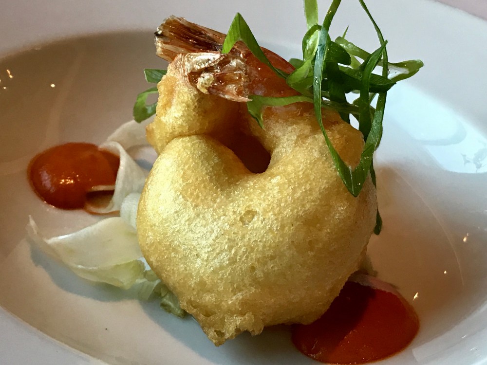 For a second course we moved to Chef Kurt’s menu. Jerry had a salad of bibb lettuce and three peas (English, snap and pea pods) — fresh and delicious. I had two fat polenta battered jumbo shrimp with fennel slaw and romesco sauce. The shrimp were fine, the slaw and sauce were superb.
