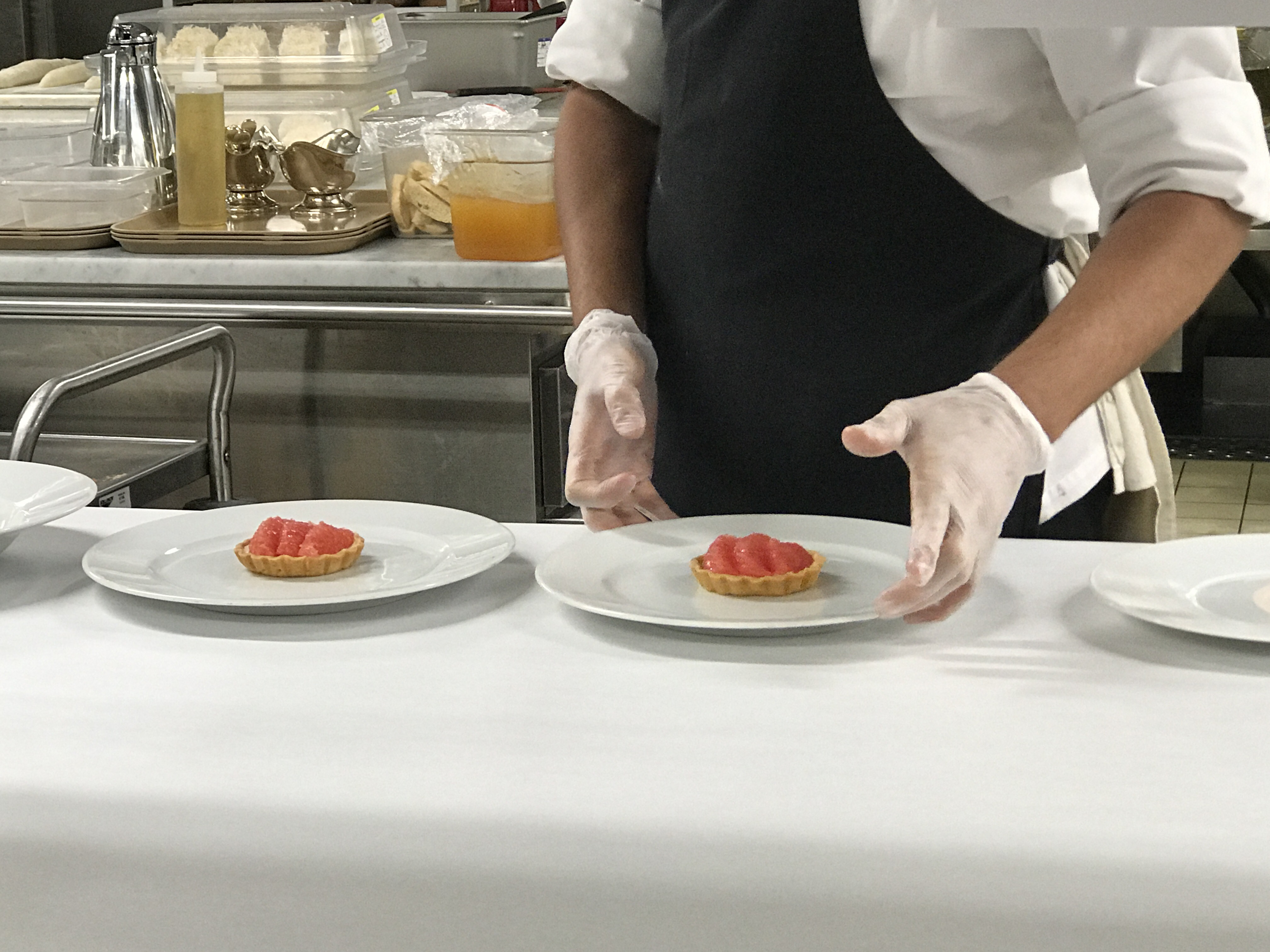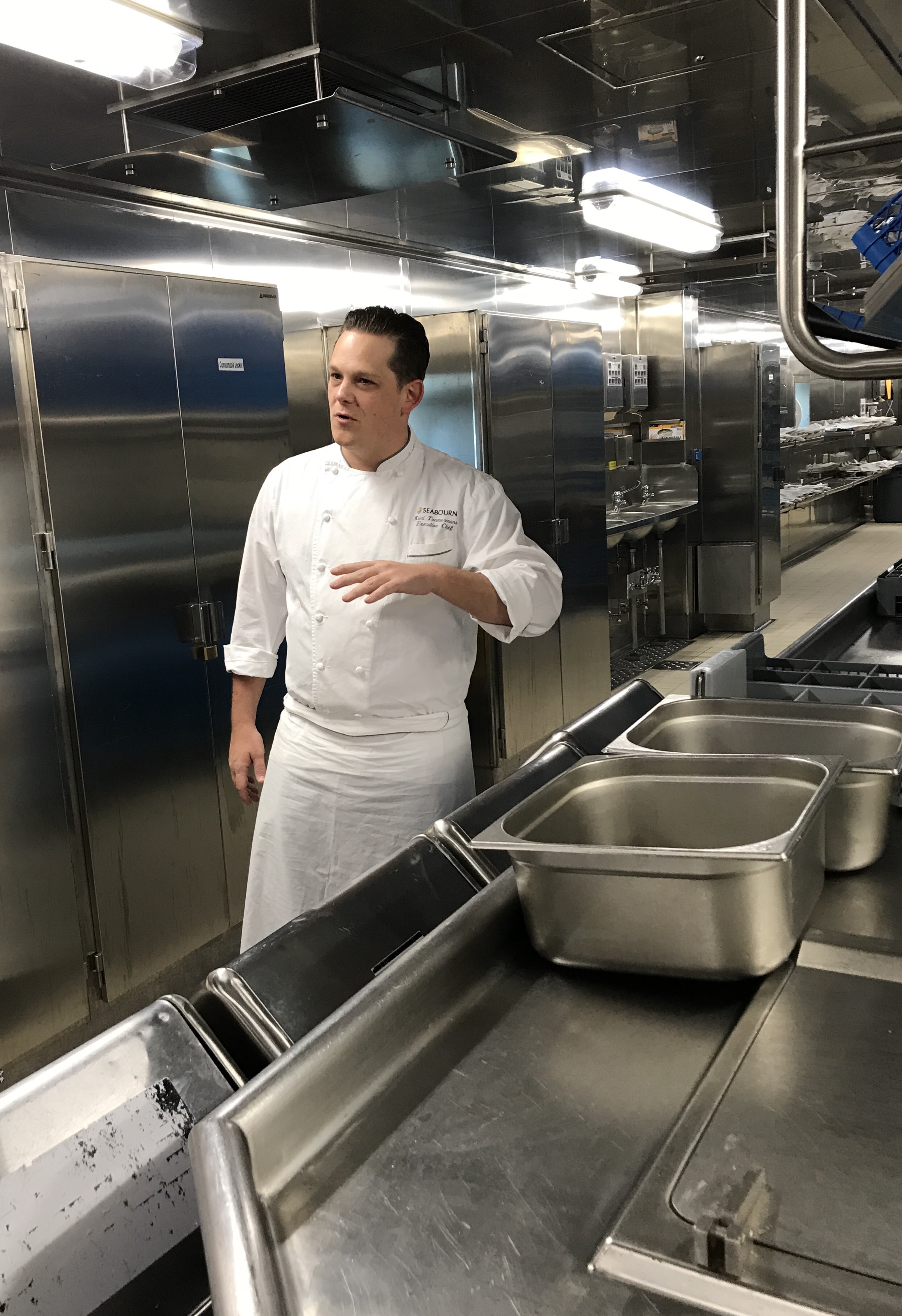 As executive chef, he oversees all the food production on the Encore — from the fanciest (the Restaurant, where night after night he expedites the entrees), to the Colonnade (buffets at breakfast and lunch, fixed menus at dinner) to the sushi restaurant, to the Keller Grill (although all the recipes, equipment and processes there are ultimately Keller’s and frequently differ from what goes on in the other venues), to the much more informal outdoor Patio (where we like to eat.)