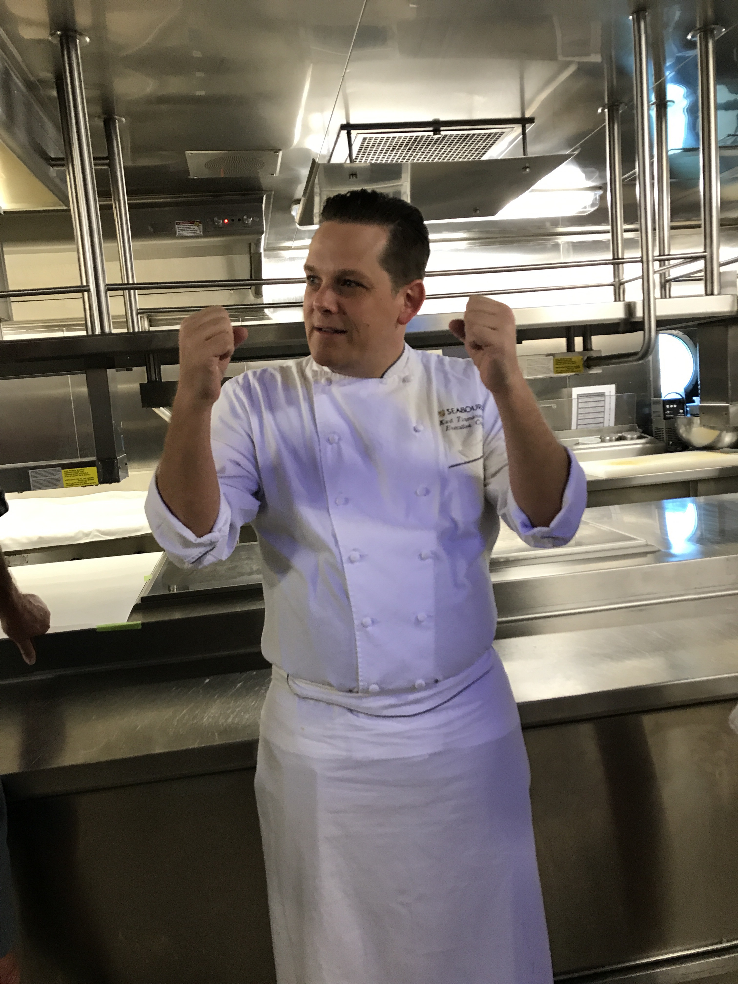 He’s been with Seabourn for ten years (plus one week, he says) and clearly knows the company well. Although he was discrete about corporate issues, he was heavily involved in the galley design of the new ships, opened the Encore and may take a similar role with the Ovation. All of which is to say, he knows his stuff.