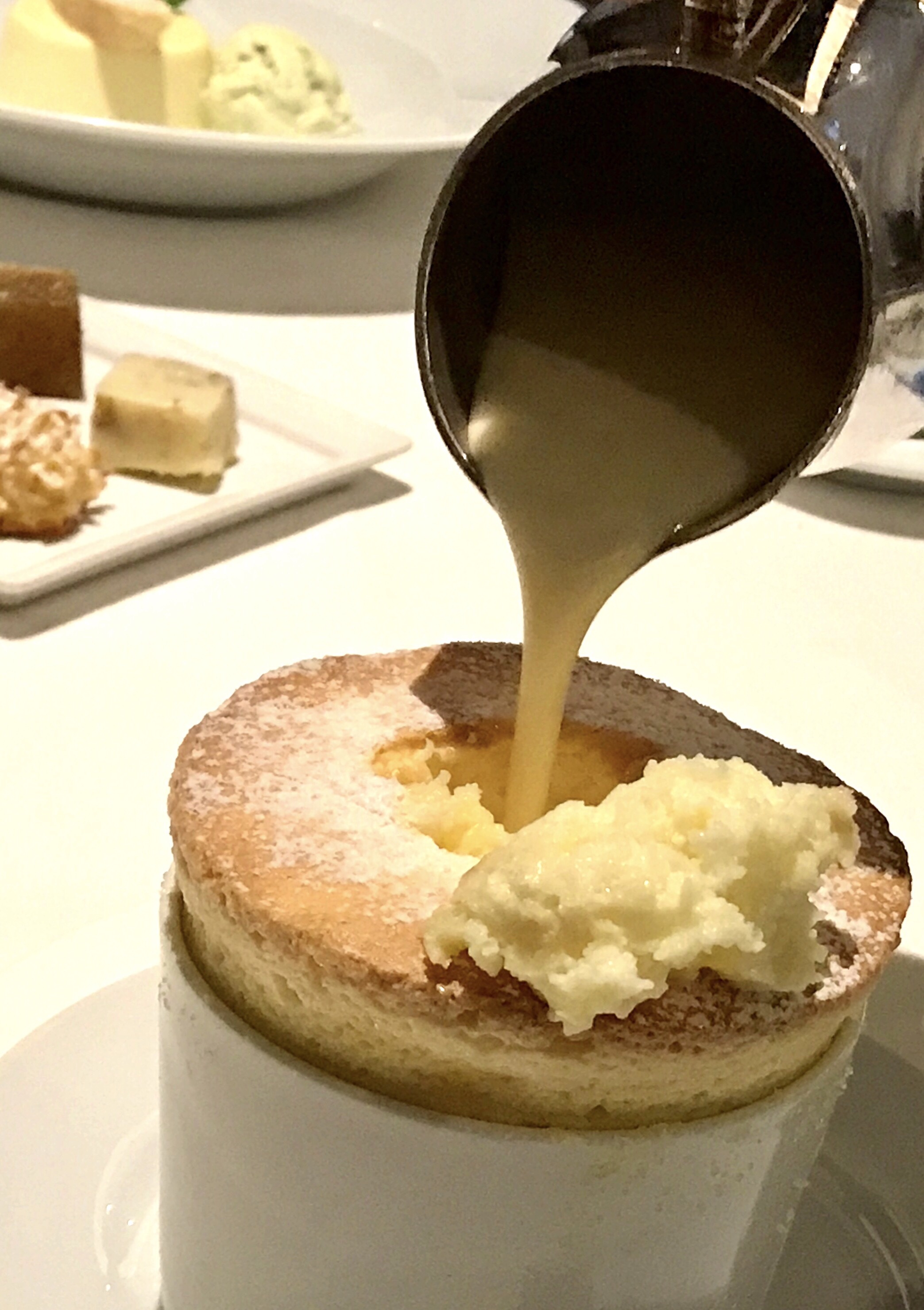 And finally, dessert. Jerry had a saffron panna cotta, forgetting he doesn’t love saffron, especially in desserts. I had a fabulous hot tangerine soufflé with creme anglaise. Citrusy and eggy — like French toast without the toast. Probably not high on the pancreatic diet but I took my pills and loved it anyway.