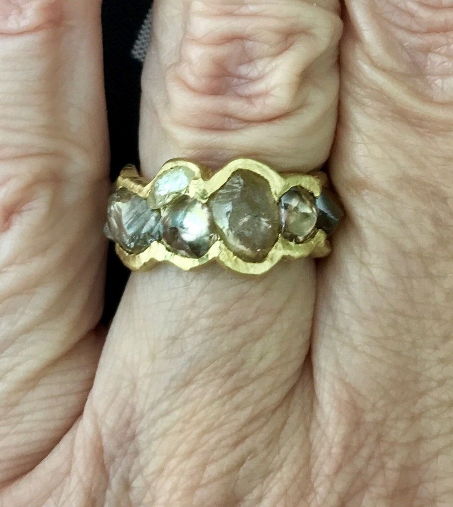 Jennifer is a ring whisperer. She and I talked, she sketched, we talked some more. She heard what I was saying and produced a ring I will always cherish. There is nothing smooth and simple about it, but all of it is real. Raw diamonds, lit from within, hammered gold (the same gold that formed my first two wedding rings, reborn), an organic circle around my finger, not a linear path but a stunning river of diamonds, finding its own way.