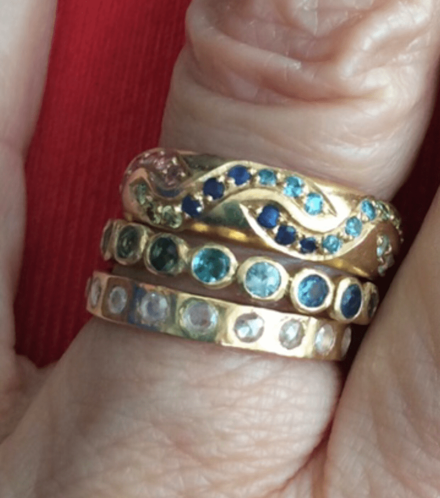 This may be heresy for some people but for me, it makes visceral sense. I wore that plain gold band for 25 years, sometimes paired with a stone, sometimes not. On our 25th anniversary, Jennifer designed an anniversary ring — an eternity ring of sorts with waves of colored diamonds, going round and round and never stopping. But it was too big to wear with my wedding ring, so we took a big step and redesigned it. It was not without a pang that I left the band with Jennifer to redo, but it was the right thing. She made my wedding ring slimmer, and studded it with tiny white diamonds. I often wore it with a band of gold circled multicolored sapphires. That seemed right — a celebration of a marriage more colorful, more adventuresome and more capable of growth than I had had any idea of.