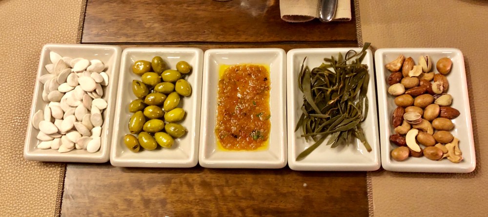 As we cuddled into our seats near the warmth of the fire, we nibbled pickled seaweed, salty nuts, roasted pumpkin seeds and bread with a sweet chili sauce and contemplated the menu.