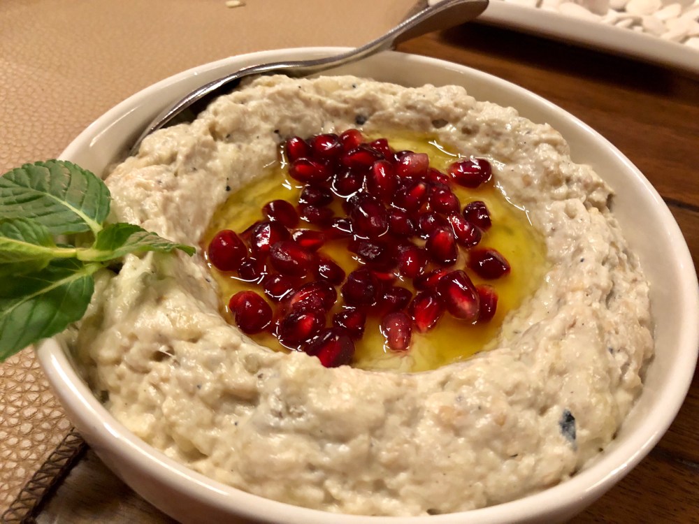 Of course we had hummus, blander than usual (No garlic, maybe?), but puréed silky smooth. Fattoush with a phenomenal dressing, tart with lemon and sweetened with pomegranate molasses, and moutabel a creamy eggplant spread that’s even good when it’s not piled with pomegranate seeds doing their best ruby red jewel imitation like they were tonight.