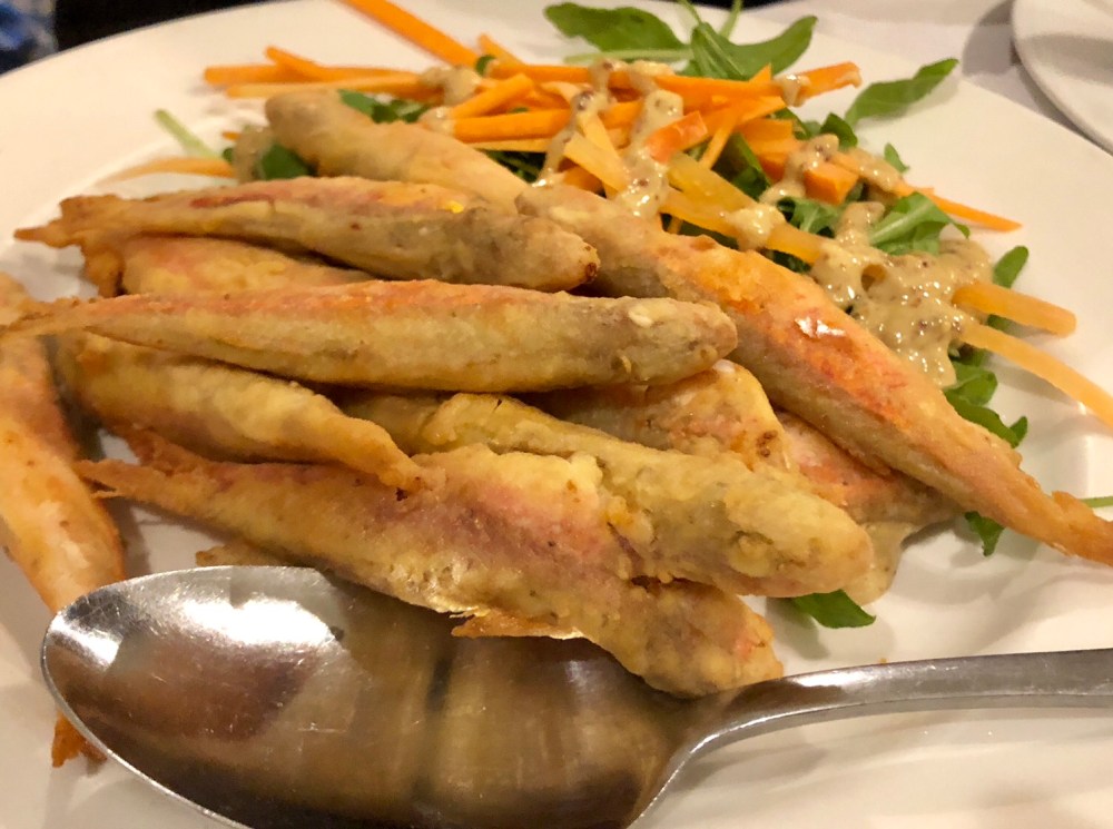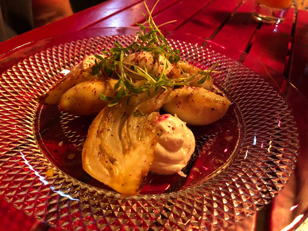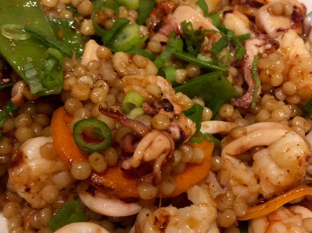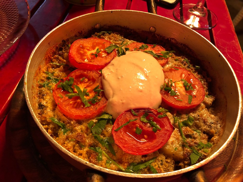 We shared calamari, grilled cauliflower in lemony tahini sauce, and a ground beef simmered in tahini. A goblet of salty caramel cream and popcorn was a blissful finish, before a tired walk back to the hotel.
