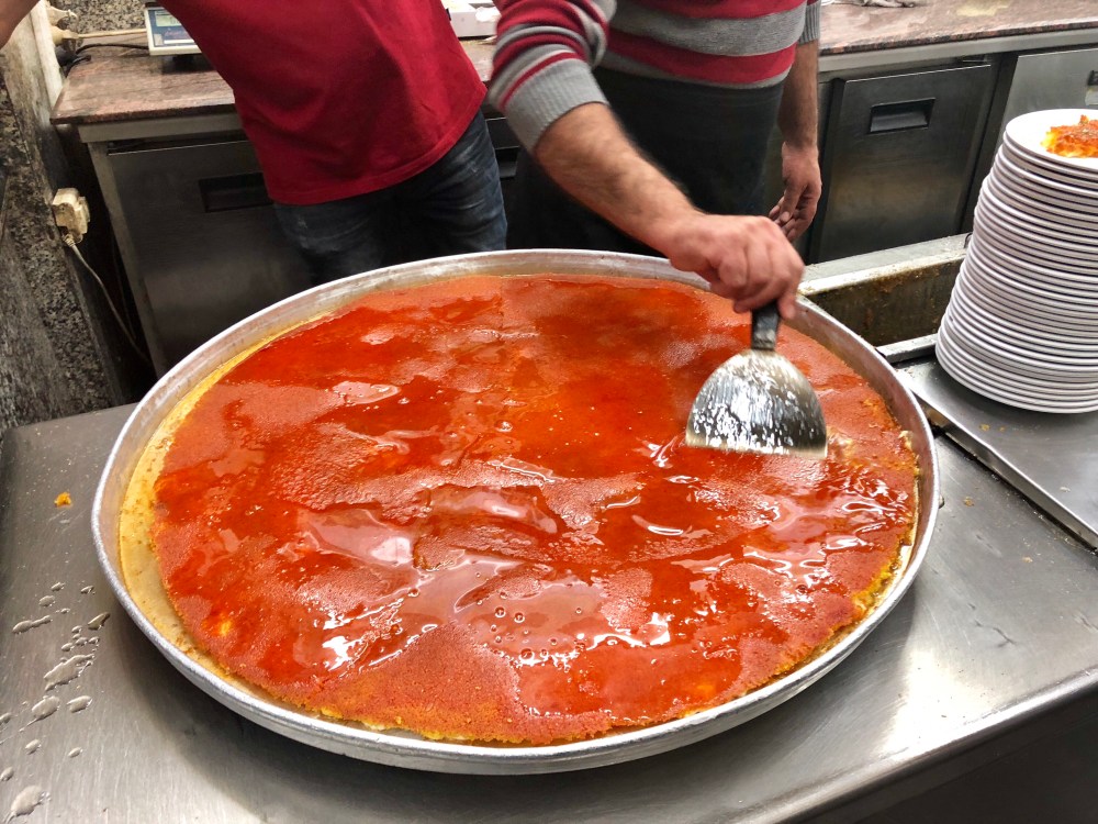 I’ve had different versions in different places, but the bakery Amir takes us to in Jerusalem is better by a mile. Today we got extra lucky — a brand new pan was coming out of the oven as we were arriving. We watched them ladle on the syrup, sprinkle the nuts, and carve out a piece for us, a small square that seemed tiny til it hit the plate.