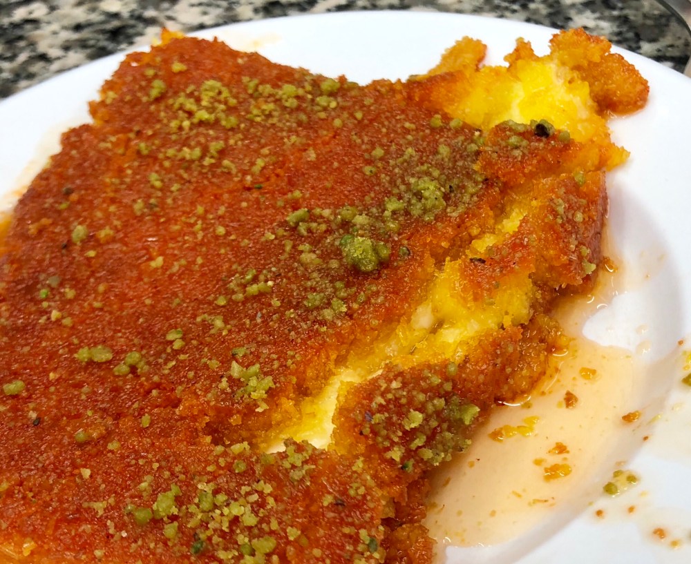 Knafeh (there are probably a dozen ways to spell it and almost as many to make it) is a sweet Palestinian dessert found all over the MidEast made of fresh cheese layers with semolina or shredded phyllo dough, cooked until some magic happens, brushed extravagantly with sugar syrup, sprinkled with crush pistachios. and eaten warm.