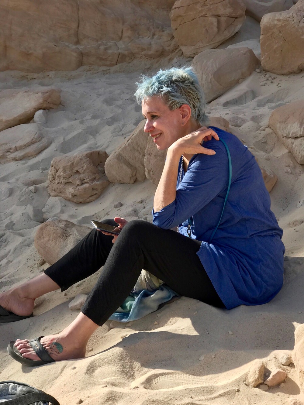 That day is spent walking the sands, climbing into tunnels (not me), collecting rocks and hiking in the Timna Valley (an exercise that landed me with a crack, knee first, on a rock.)