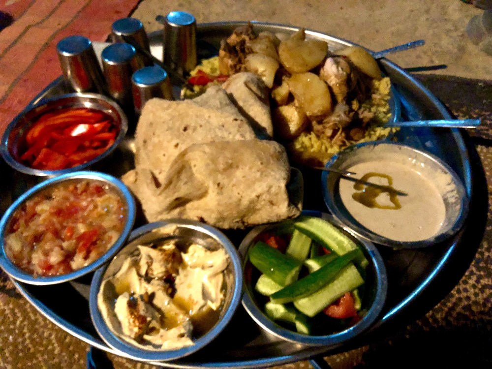 We eat with our hands, trying (but not succeeding very well) not to use our left. The food is just wonderful, the bread phenomenal. We scoop and eat, scoop and eat. Eventually we are sated, happy, and covered with rice.