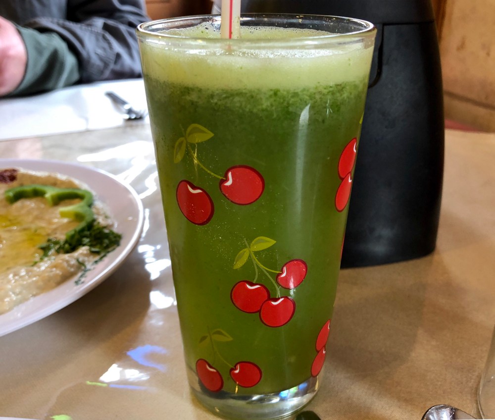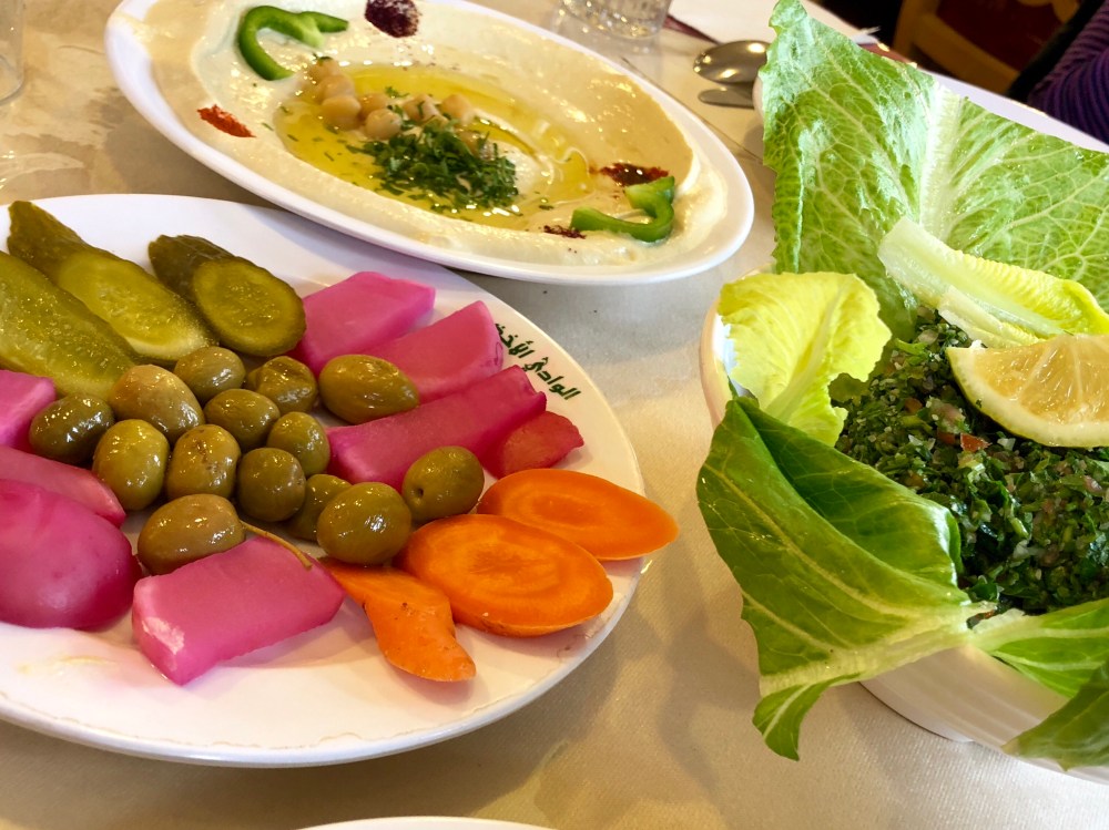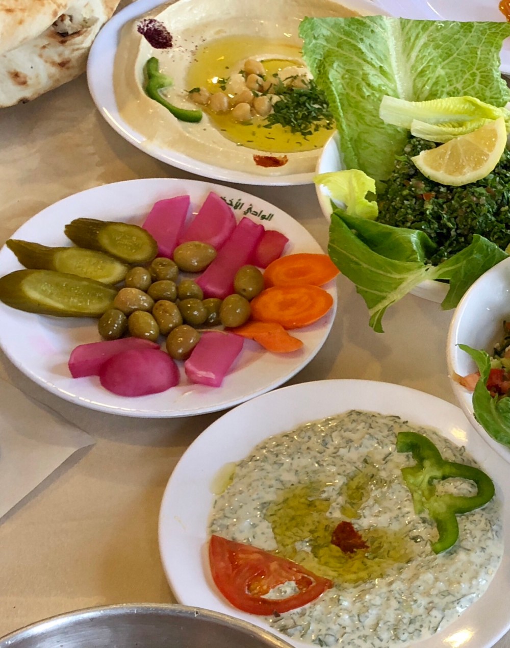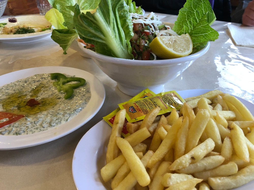 At our table, the only choice we are offered besides drinks (and that choice does not include alcohol) is chicken, lamb or mixed grill. I pick neither. Within minutes the table is covered, covered, with bowls of hummus and herby labne, and pickles and olives, and tabouli and salad, and a big basket of the huge warm bread loaves. And French fries, for some reason. I am sipping on my mint lemonade, my favorite new thing.
