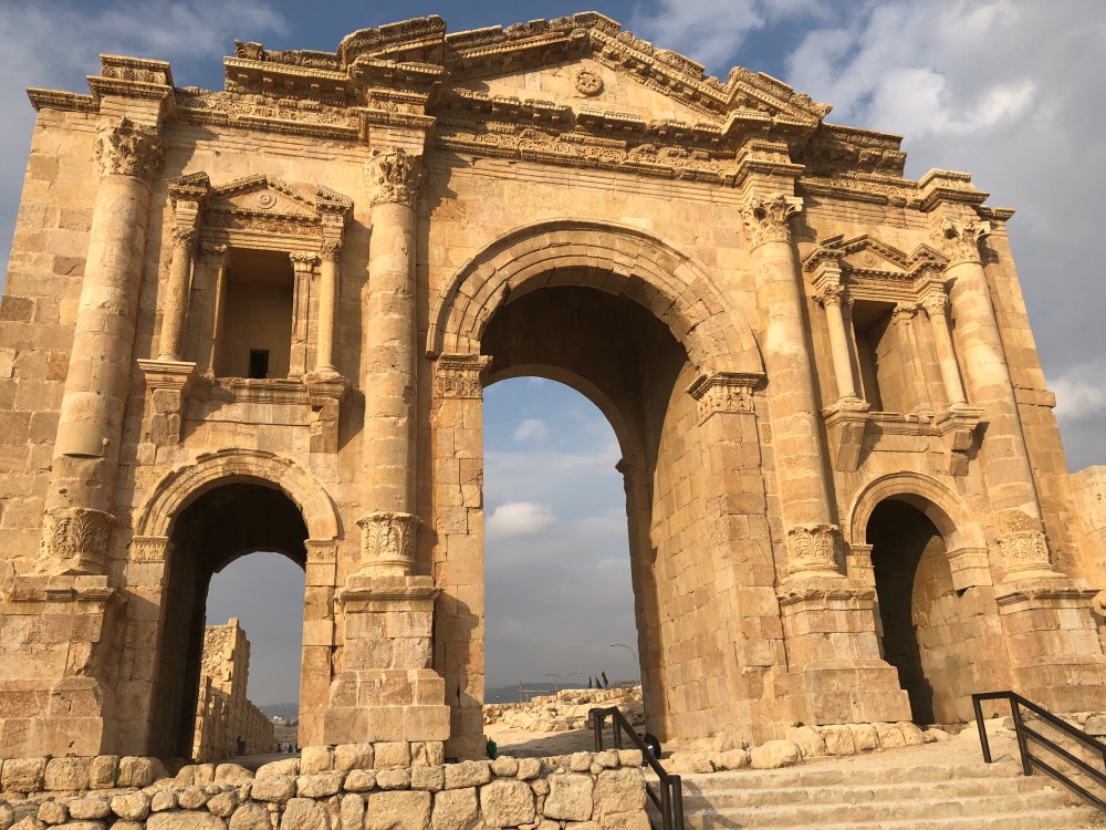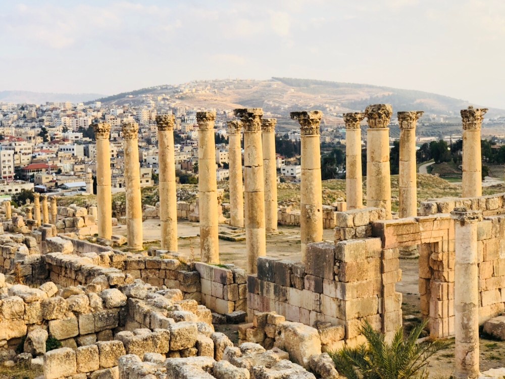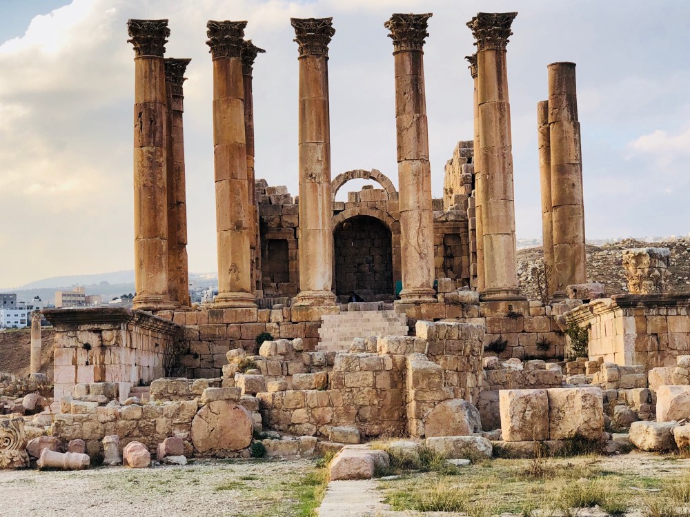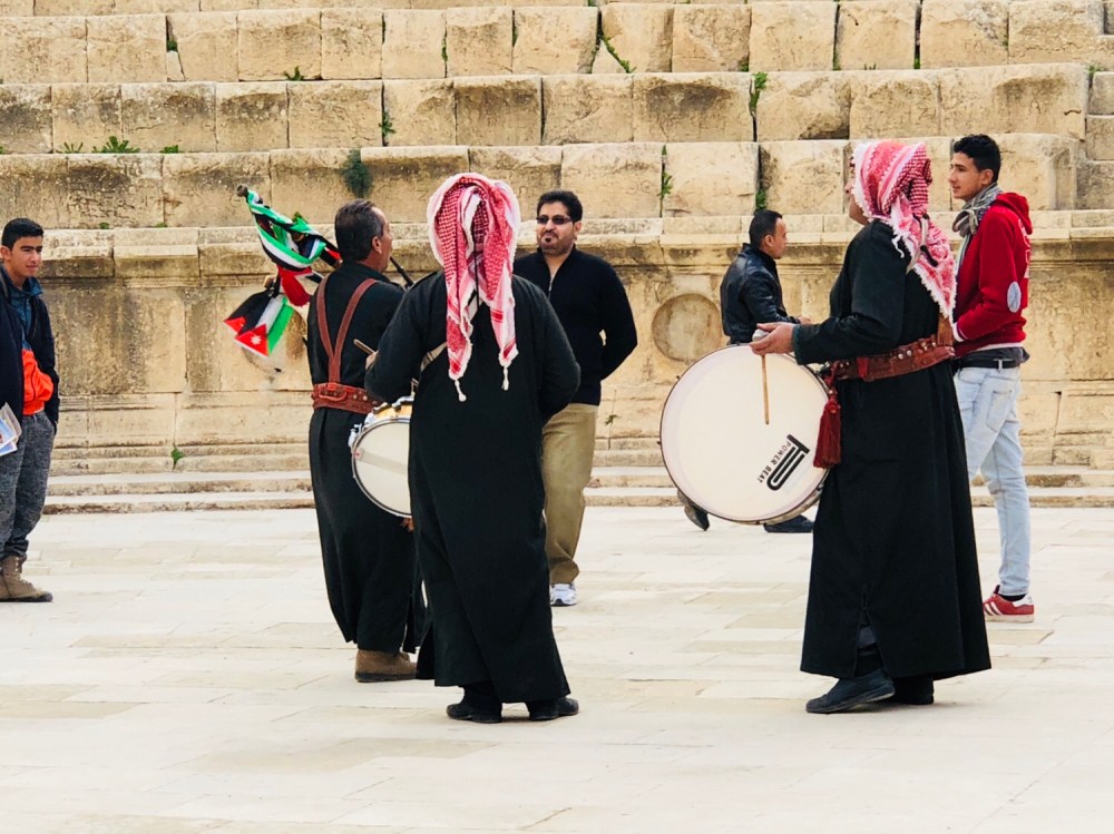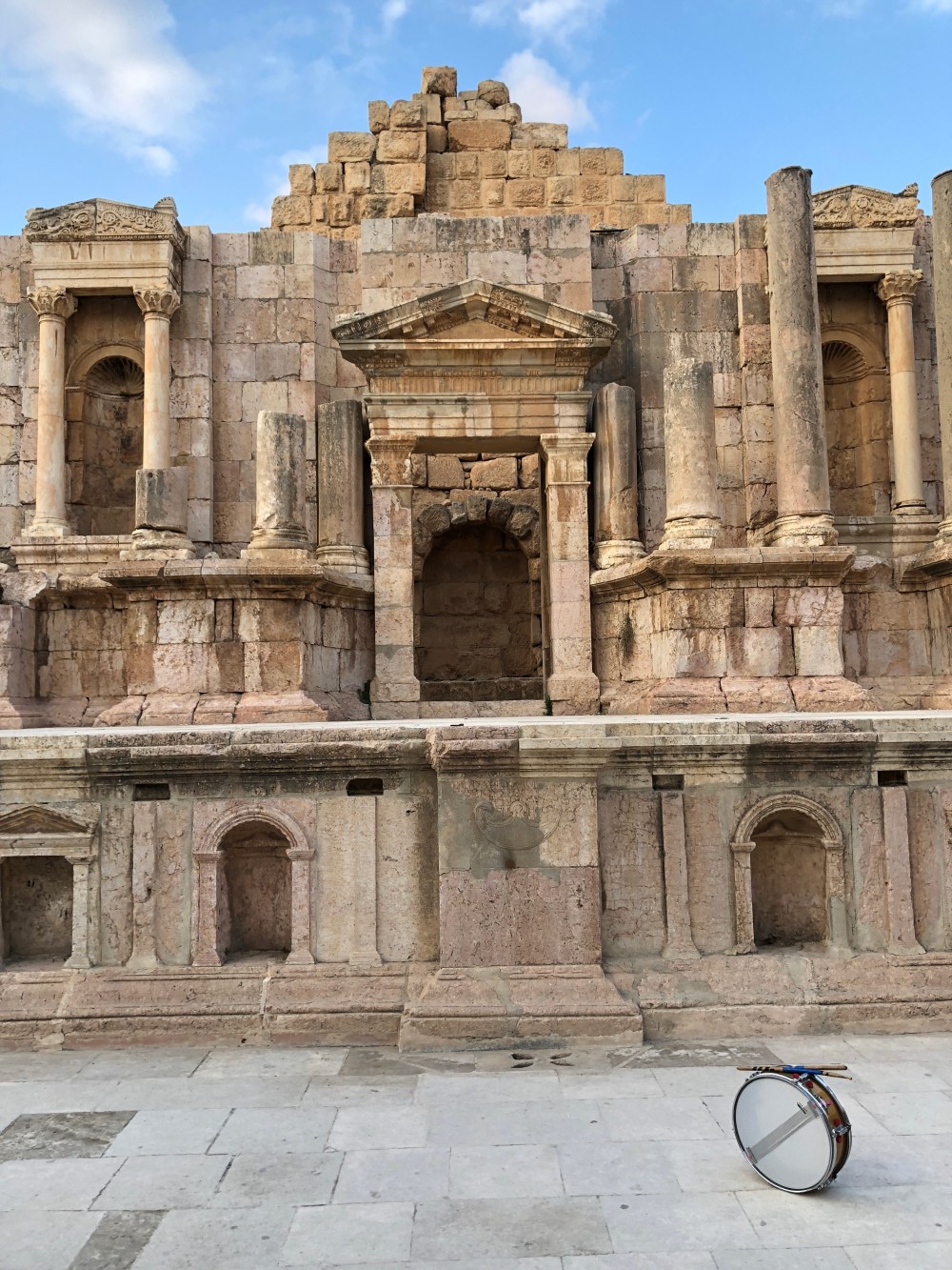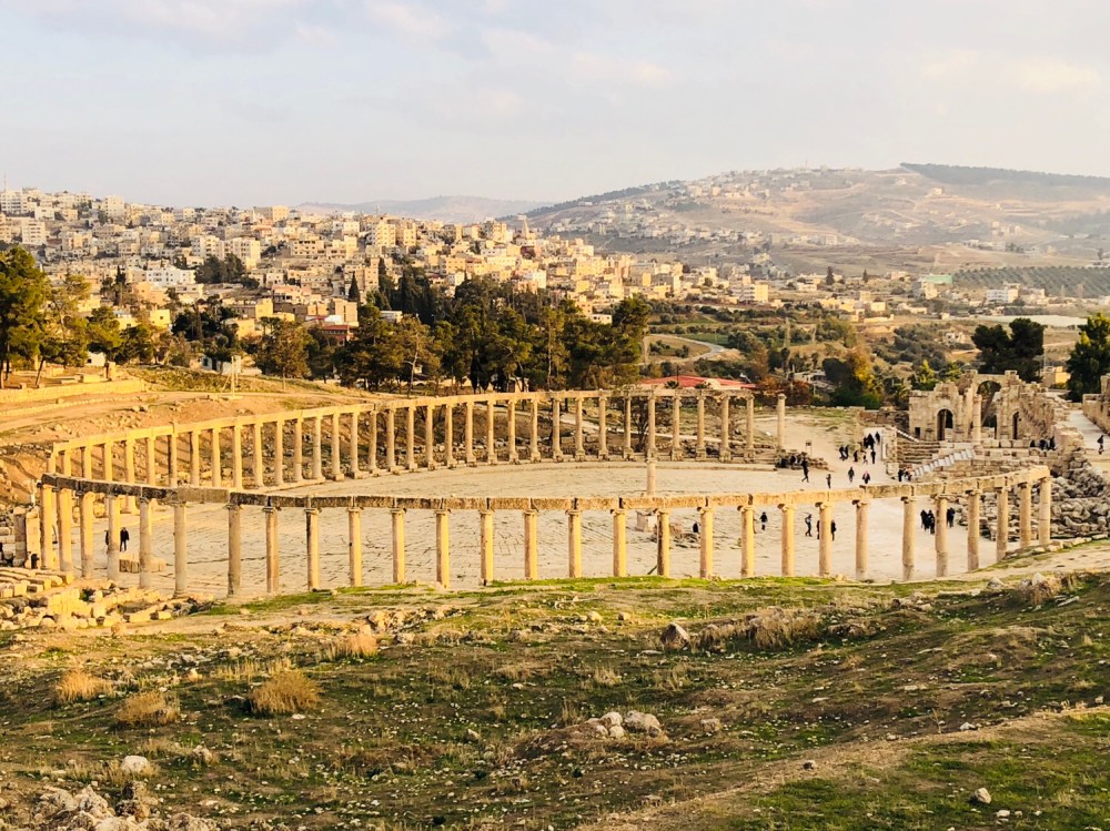 In Jerash, early Arabs settled more than 1000 years BCE, and then the Roman army came in during its heyday. Within the span of a couple of hundred years the place was rebuilt along classical, Greco-Roman lines. Visitors walk through Hadrian’s Gate, along a real avenue lined with columns, passing a temple to Zeus and one to Artemis, one to Bacchus (later turned into a mosque), ancient frames of shops and places of commerce, a theater with eerily perfect acoustics (where retired members of the Jordanian military band play the drums and, oddly, the bagpipes), and a hippodrome where chariot races were held before up to 15,000 spectators.