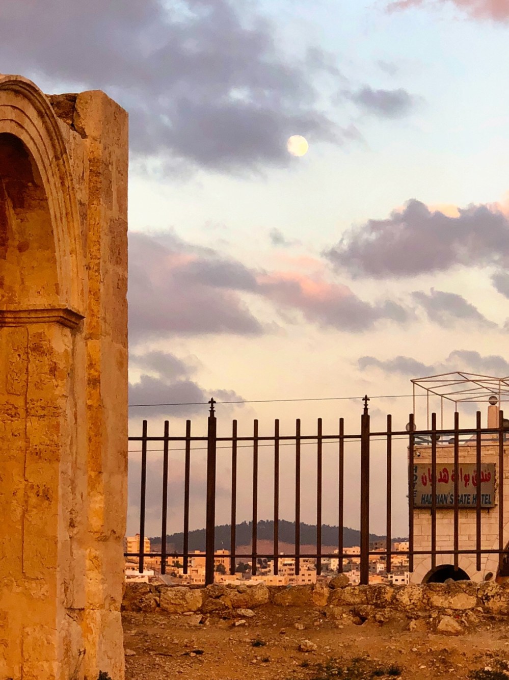 As the sun gets close to setting, the columns and buildings are lit with that late afternoon glow photographers love. And it gets cold. We head back to our warm van, heads reeling with the unexpected time-travel. A nearly full moon rises over the gate, as it surely did more than 2000 years ago. I have goosebumps.